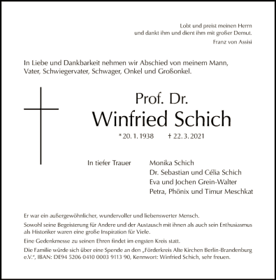 Winfried Schich (* 20. Januar 1938 in Berlin; † 22. März 2021 in Berlin) war ein deutscher Historiker. Winfried Schich wurde nach einem Studium der Geschichte 1974 an der Freien Universität Berlin mit einer Arbeit zum Thema Würzburg im Mittelalter.