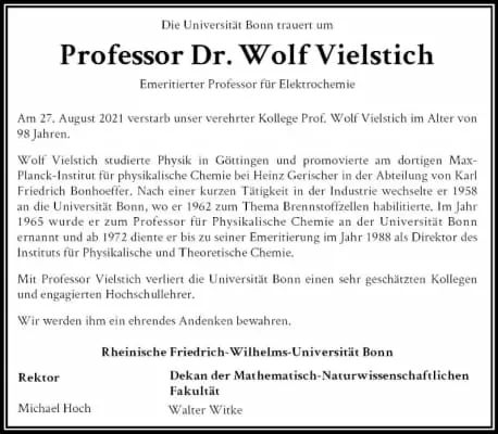 Wolf Vielstich (* 18. Juni 1923 in München; † 27. August 2021) war ein deutscher Elektrochemiker, der von 1965 bis 1988 als Professor an der Universität Bonn lehrte; ab 1972 war er dort Institutsdirektor.* 18. Juni 1923 in München; † 27. August 2021
