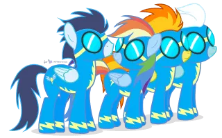The Wonderbolts are a squad of Pegasus ponies who perform aerial acrobatics and demonstrations. They leave long trails of thunderclouds when flying, much like how Rainbow Dash leaves a rainbow streak. Their name is a portmanteau of the words "wonder" and "thunderbolt". Spitfire is the team's leader.