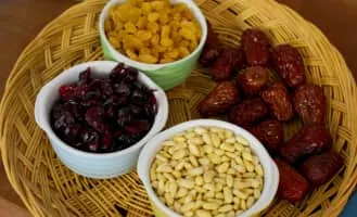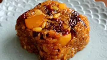 Yaksik or yakbap is a sweet Korean dish made by steaming glutinous rice, and mixing with chestnuts, jujubes, and pine nuts. It is seasoned with honey or brown sugar, sesame oil, soy sauce, and sometimes cinnamon.