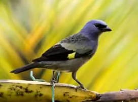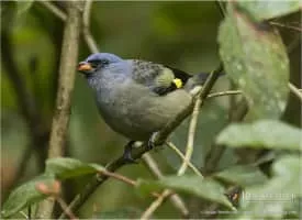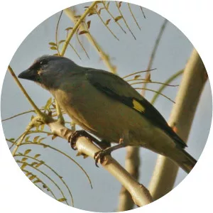 The yellow-winged tanager is a neotropical member of the tanager family. It is of average size for a tanager, about 18 centimetres. It is distinguished by the yellow patches on its dusky green wings, marking an otherwise dark bluish and gray body. It has a pale lavender tone on its throat and breast.
