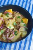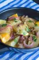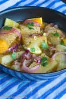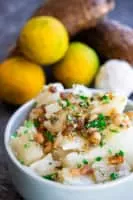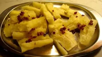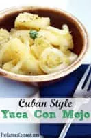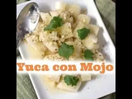 Yuca con mojo is a Cuban side dish made by marinating yuca root in garlic, lime, and olive oil. Often, onions are included in the marinade. Also known as one of Cuba's national dishes.