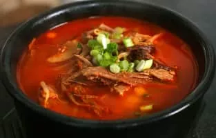Yukgaejang or spicy beef soup is a spicy, soup-like Korean dish made from shredded beef with scallions and other ingredients, which are simmered together for a long time. It is a variety of gomguk, or thick soup, which was formerly served in Korean royal court cuisine.