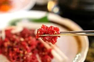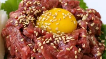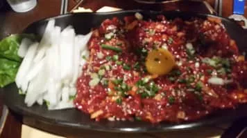 Yukhoe is a raw meat dish in Korean cuisine that resembles a steak tartare. It is most commonly made of beef but it can come in various kinds and cuts of meat. Yukhoe literally means 'raw meat'. Therefore, in the strictest context, the term designates any dish of raw meat cut up for consumption without the marinade.