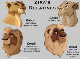 Zira was a female lion. She was the leader of the Outsiders. She was the mother of Kovu, Nuka, and Vitani. After Scar became the king of Pride Rock, he chose Zira's son, Kovu, to be his heir and protégé.